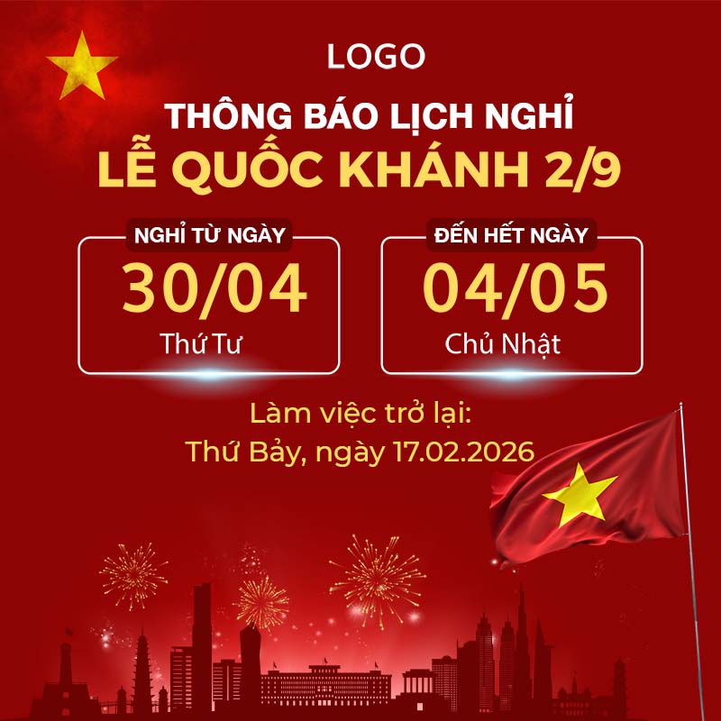 Điểm đặc trưng của template này là thiết kế trang trọng, nổi bật với tông màu đỏ chủ đạo – màu của quốc kỳ Việt Nam – kết hợp các chi tiết vàng của ngôi sao và pháo hoa rực rỡ trên nền đường chân trời thành phố. Mẫu thiết kế này không chỉ thu hút thị giác mà còn truyền tải rõ ràng các thông tin cần thiết: “THÔNG BÁO LỊCH NGHỈ LỄ QUỐC KHÁNH 2/9”, “Nghỉ từ ngày”, “Đến hết ngày”, và “Làm việc trở lại”. Bố cục rõ ràng, dễ đọc, phù hợp để đăng tải trên các kênh truyền thông nội bộ, mạng xã hội hoặc in ấn.