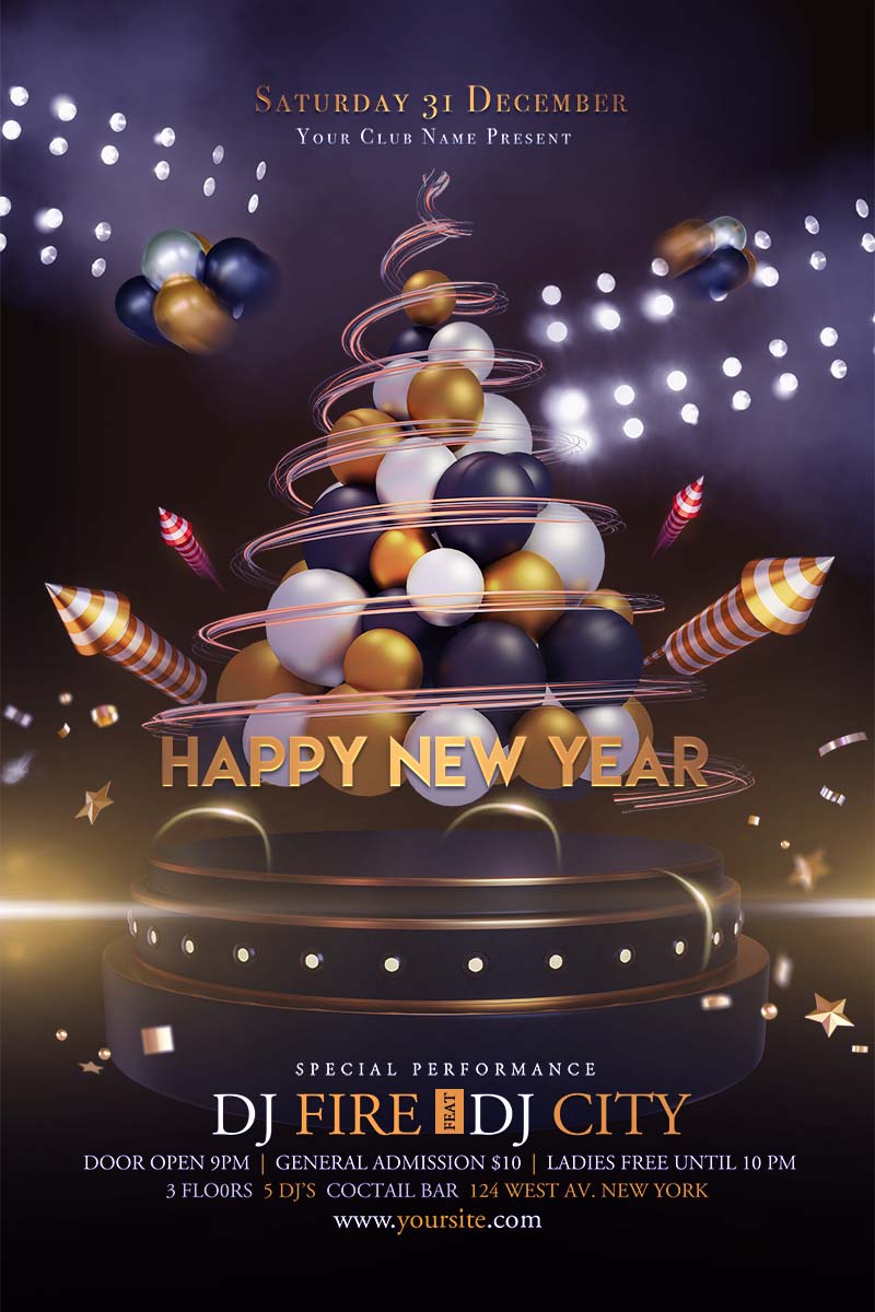 Đừng bỏ lỡ cơ hội tạo ra những ấn phẩm truyền thông, poster tiệc cuối năm độc đáo và ấn tượng một cách dễ dàng và nhanh chóng. Template Poster Happy New Year PSD là công cụ lý tưởng để bạn truyền tải những thông điệp ý nghĩa về sự thành công và thịnh vượng đến mọi người.