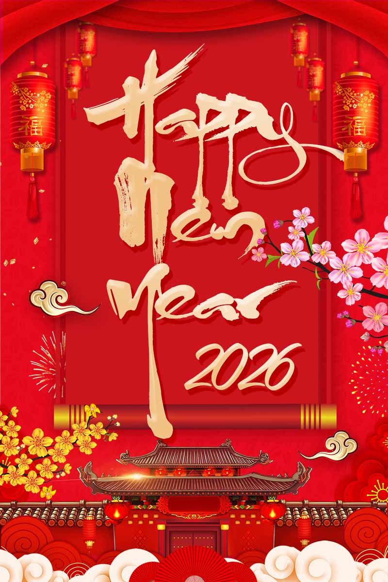 - Biểu Tượng Truyền Thống: Cuộn giấy thư pháp ở trung tâm, với dòng chữ “Happy New Year” uyển chuyển, mềm mại, không chỉ đẹp mắt mà còn mang ý nghĩa của sự trang trọng, uy quyền. Lồng đèn và hoa mai là những biểu tượng không thể thiếu của Tết.