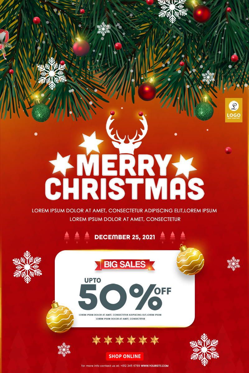 - Cụm từ “MERRY CHRISTMAS” được thiết kế bằng font chữ to, rõ ràng, với các ngôi sao nhỏ xung quanh. Phía dưới là banner đỏ với chữ “BIG SALES” và một khung trắng với dòng chữ “UPTO 50% OFF”, làm nổi bật thông điệp giảm giá mạnh mẽ, kích thích hành động mua sắm của khách hàng.