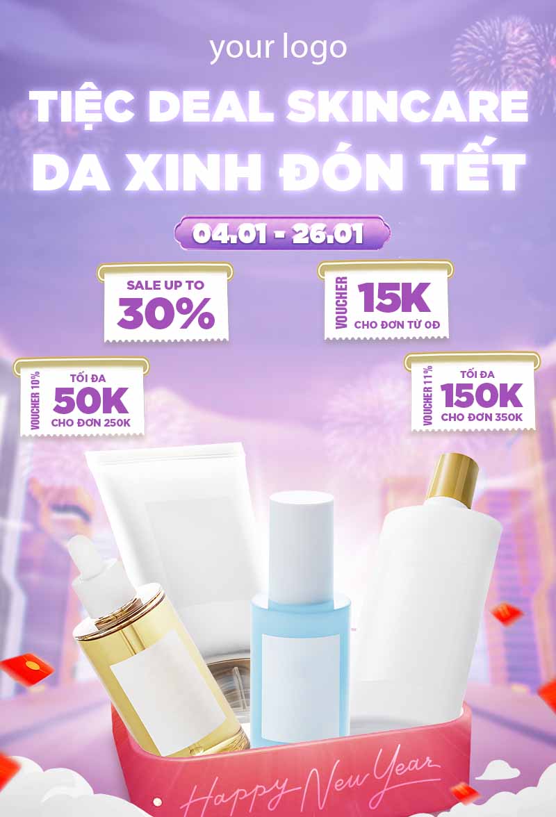 - Bố Cục Tinh Tế: Các sản phẩm skincare được đặt ở vị trí trung tâm, cùng với các thông điệp về ưu đãi và voucher. Bố cục này tập trung mọi ánh nhìn vào sản phẩm và khuyến khích khách hàng hành động.