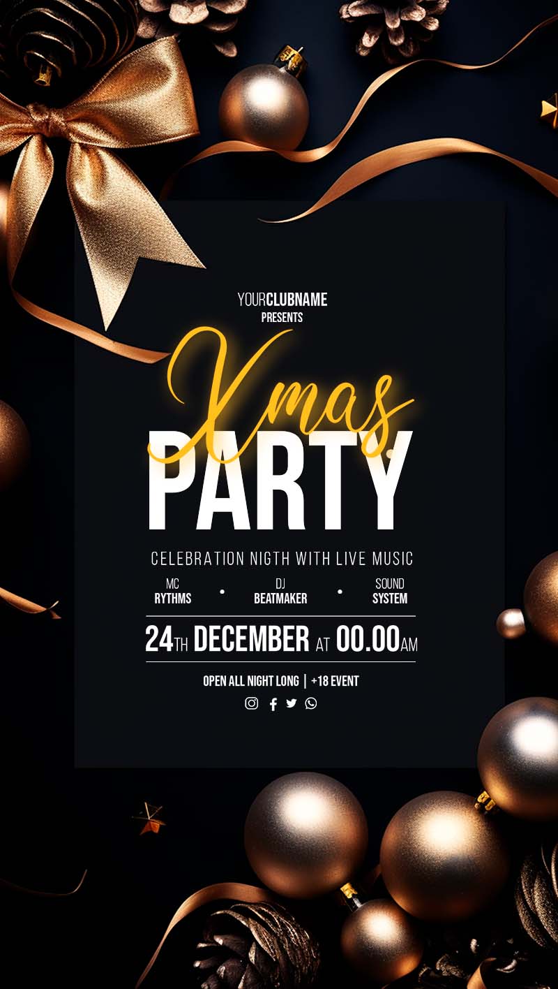 - Bố Cục Độc Đáo: Bố cục được sắp xếp một cách cân đối, làm nổi bật thông điệp chính “X’mas PARTY” và các thông tin quan trọng khác, giúp người xem dễ dàng nắm bắt thông tin và cảm thấy hứng khởi.